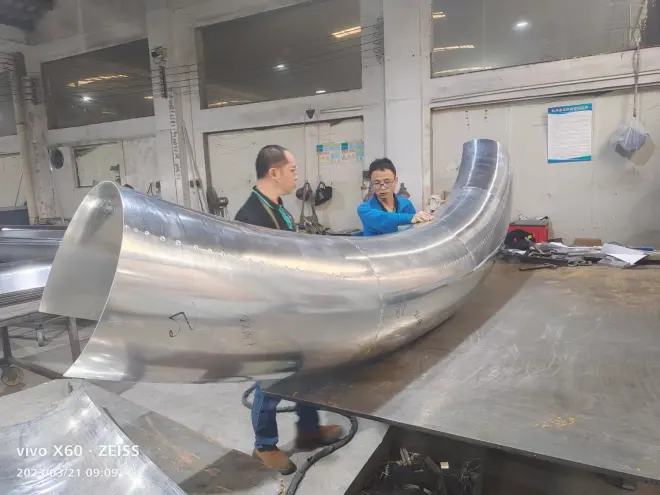 预加工:将成型后的双曲铝单板进行预加工,包括边缘修整、孔洞开放、折边等加工处理,以便后续的安装使用。