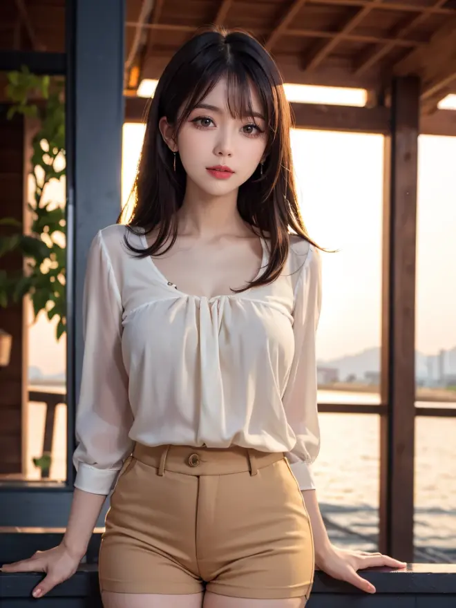 best quality, (mature:1.3),perfect face, beautiful face,western, sharp focus, solo,beautiful woman,sexy,shiny skin,Navy blouse, beige shorts, soft light,cinematic lighting, sunny, dusk, outdoor,depth of field,shidudou,red_dress,负面提示词: