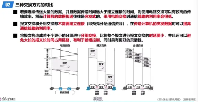 电路交换直通,报文交换需要存储转发,分组交换相比报文交换可以避免报文过长带来的时延,错误处理困难。