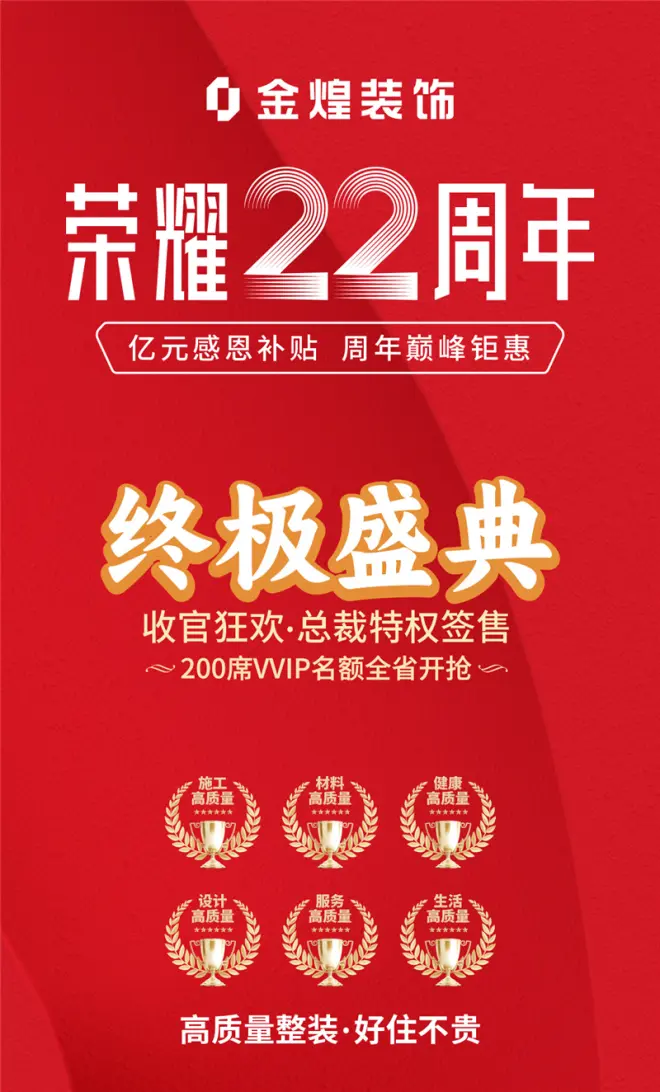 22载岁月如歌,22载突破创新。明媚的夏日,金煌装饰即将迎来22周年庆终极盛典。从5月中旬迄今,携高质量整装和亿元补贴、巅峰钜惠,公司举办了缤纷的让利活动,推出大量切实保护消费者利益的举措,回馈新老客户,让“高质量整装,就选金煌”美名响彻三湘。7月2日,将在长沙小天鹅戴斯酒店举办终极盛典,诚邀广大客户共赏。