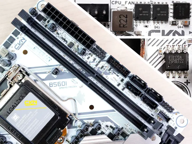 右侧散热器表面金属拉丝处理,印有“56”,“CVN GAMING"的标记,由于体积比较大,兼做了IO部分的护甲,不过顶部没有散热器;CPU供电接口为8pin设计;主板上没有灯,不过PCH散热片的CVN logo,不同角度的光线会照射出不同的颜色,也是蛮漂亮的。