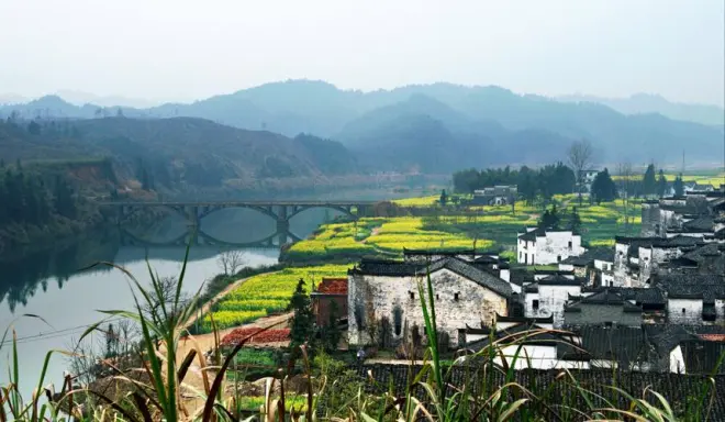 江阔山青晨雾朦,踏春翁妪去桥东。