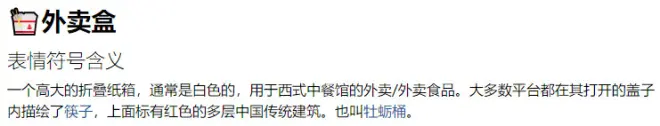 我看到了熟悉又陌生的东西,那是一个绘文字:🥡中餐外卖盒,统一码码位 U+1F961