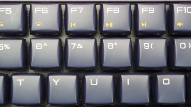 不得不说,杜伽Hi Keys是采用了真窄边框设计,取消了指示灯设计后让机身看起来更加简洁。杜伽Hi Keys键帽字体相对来说比较大一些,也比较圆润。作为支持MacOS的机械键盘,下面几个键帽采用了对应MacOS/WIN的组合文字标识。F1~F12按键均采用了组合键设计, 每个按键下方都有对应功能的图标来方便用户辨识。