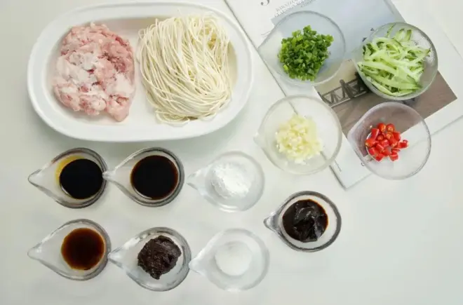 肉末250g、面条适量、葱花适量、蒜末适量、小米辣适量、生抽20g、老抽10g、蚝油15g、甜面酱20g、豆瓣酱20g、糖2g、淀粉5g、黄瓜丝适量