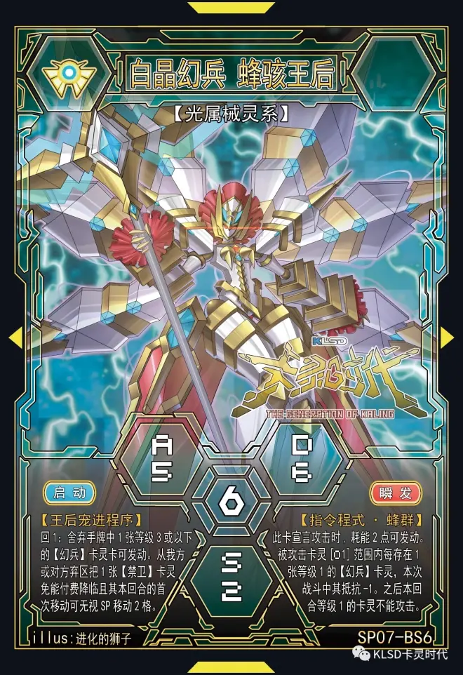 后棋卡灵拥有目前卡灵最高的等级:6,来代表了他强大的地位。但他们的AP与国王是一致的,都是“5”点。我想这是官方出于平衡的考虑。此前也有提到,国际象棋中,凡是可以无视距离移动的棋子在卡灵时代中,其SP都为2。而现阶段的平衡体系,如果一个卡灵的SP为2,那么他的攻击力一半不会超过5(从补充包002发售的卡牌可以看到这点。但官方并没有表明2速的卡灵就不能拥有超过5点的攻击力。)