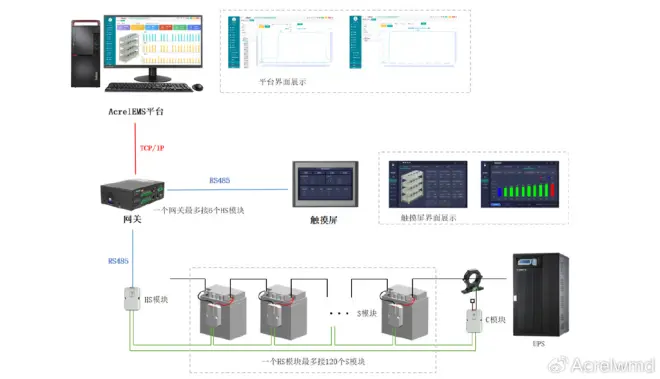 该系统具有监测电池的电压、内阻与内部温度功能,安装、维护与接入非常方便。系统主要由ABAT100-S模块、ABAT100-C模块、ABAT100-HS采集器、ATP010KT触摸屏组成,可通过采集器查询告警与实时数据、设置参数等,可选配监测平台实现网络化集中管理