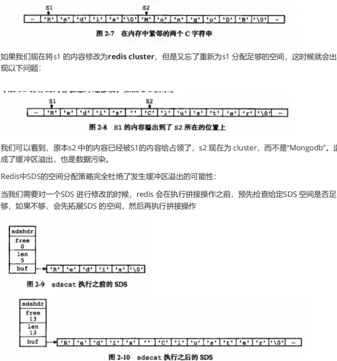 程序中有两个在内存中紧邻着的 字符串 s1 和 s2,其中s1 保存了字符串“redis”,s2 则保存了字符串“MongoDb”: