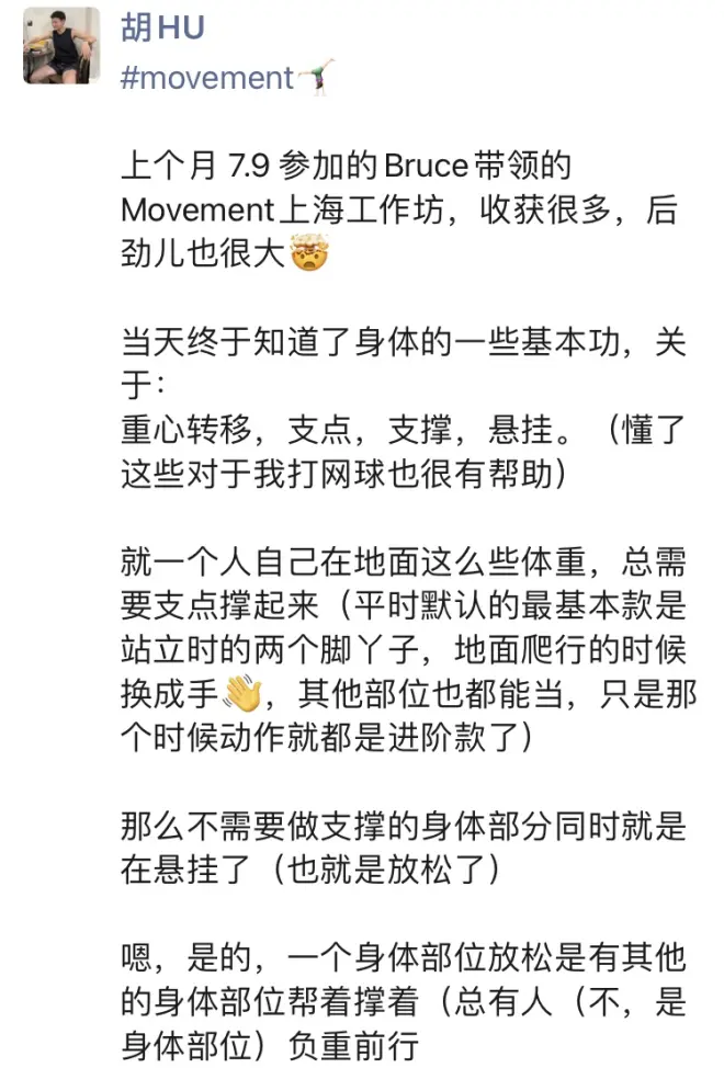 最后我还和大家说,我们练习动作都是为了吸收动作背后的内容和原理,所以不必去纠结你现在这个阶段在练什么动作,是什么体系,以后需要练什么。所有的体系和动作套路都是用来服务你的,不要本末倒置地变成它们的奴隶。等你理解了这一点,你也就知道Movement理念大概在说什么了。