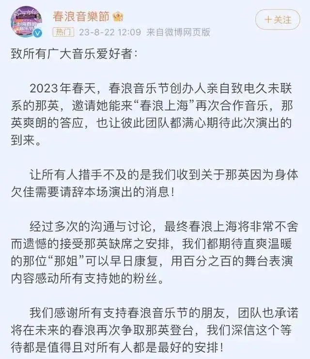 8月22日,那英突然宣布因身体欠佳辞去上海春浪音乐节,引起了许多网民的热议。