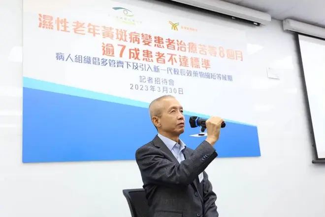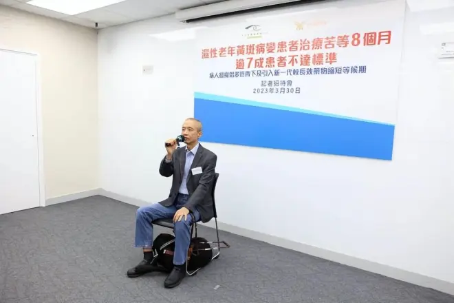 记者会最後由香港视网膜病变协会会长曾建平先生作总结,他乐见经过多年争取过多年争取後,政府终於在2022年底,首次将湿性老年黄斑病变及糖尿黄斑水肿的一线药物(抗血管内皮生长因子眼内注射)纳入为撒玛利亚基金资助药物,帮助有经济困难的患者用药。可是,在现今轮候及治疗等候期已严重过长的情况下,此项德政却加剧恶化前线工作压力和轮候治疗情况。