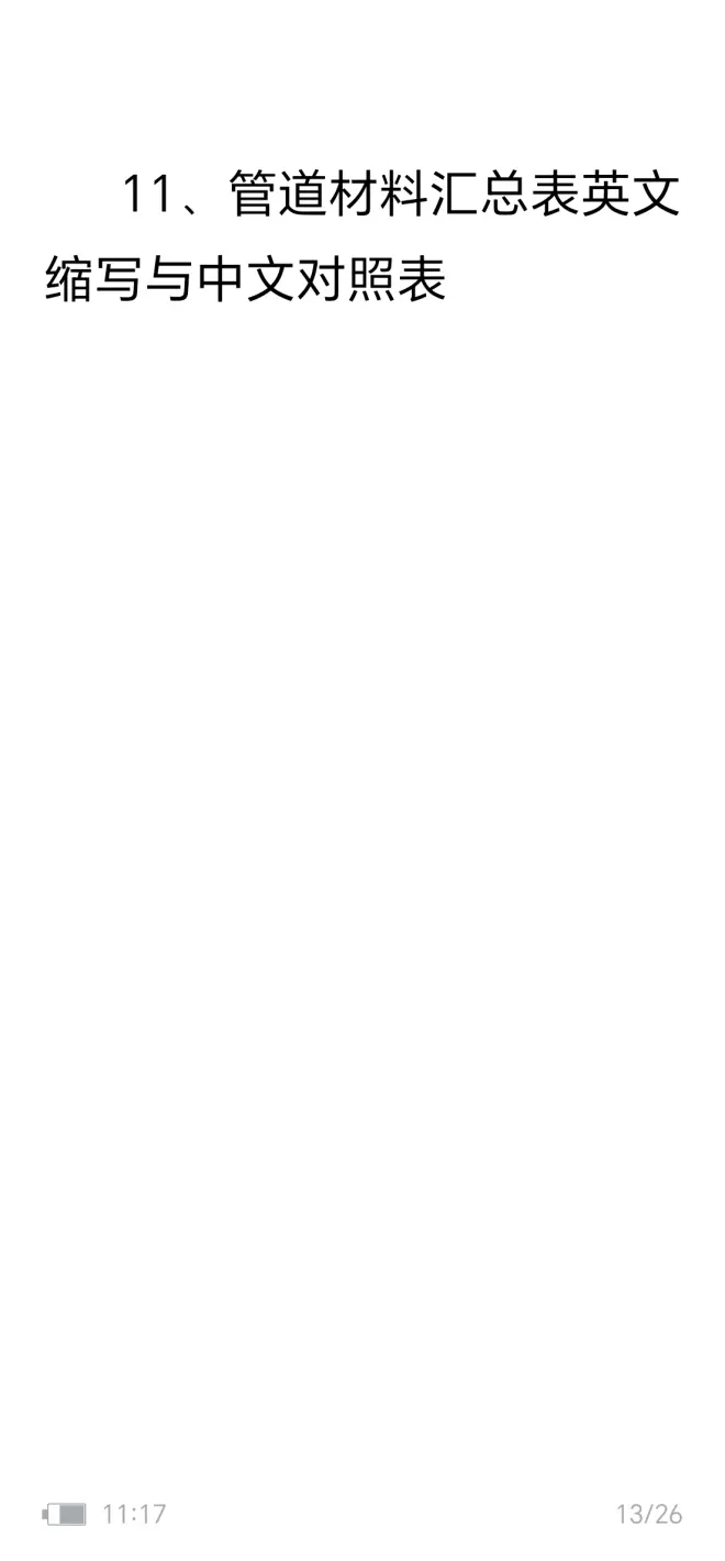 再者是如下这些单线图内所涉及到的材料中英文对照表格,因为很多图纸都是以英文为主。 石油化工企业配管工程常用词缩写 1 管子及管件 中文名称 英文名称 缩写 管子 pipe p 快速接头 quick joint qj 弯头 elbow el 翻边短节 stub end se 长半径弯头 long radius elbow ell 加强管接头 o-let ol 短半径弯头 short radius elbow els 螺纹加强管接头 threadolet tol 斜接弯头(虾米腰弯头) milre elbow mel 焊接加强管接头 weldolet wol 异径弯头 reducing elbow rel 承插焊加强管接头 socket weldolet swcl 三通 tee t 弯头加强管接头 elbolet elol 斜三通 lateral tee lt 斜接加强管接头 latrolet lol 异径三通 reducing tee rt 鞍型加强管接头 sweepolet sol 异径管接头(大小头) reducer r 螺纹短节 nipple nip 同心异径管接头(同心大小头) concentric reducer cr 双头螺纹短节 threaded both end nipple fnip 偏心异径管接头(偏心大小头) eccentric reducer er 单头螺纹短节 threaded one end nipple hnip 管箍 coupling cpl 型锻螺纹短节 swaged threaded nipple snip 双头管箍 full coupling fcpl 管帽(封头) cap cp 单头管箍 half coupling hcpl 焊接管帽 welded cap wc 异径管箍 reducing coupling rcpl 螺纹管帽 thread cap tc 内外螺纹接头 bushing bu 承插焊管帽 socket welded cap swc 活接头 union un 椭圆形封头(管帽) ellipsoid cap ec 管堵(丝堵) plug pg 盲板 blank blk 8字盲板 spectacle blind (blank) sb 2 法兰 中文名称 英文名称 缩写 中文名称 英文名称 缩写 法兰 flange flg 法兰密封面 flange sealing face fsf 对焊法兰 welding meck flange wnf 平面 flat face ff 平焊法兰 slip-on flange sof 凸台面(光滑面) raised face rf 承插焊法兰 socket-wclding flange swf 凹凸面 male and female face mff 螺纹法兰 threaded flange tf 凹面 female face fmf 松套法兰 lapped joint flange ljf 凸面 male face mf 大小法兰 reducing flange redf 环连接面 ring jcin face rjf 特殊法兰 special flange spf 透镜面 lens face lf 法兰盖(盲法兰) blind flange bf 榫槽面 tongue and grcove face tgf 3 垫片 中文名称 英文名称 缩写 中文名称 英文名称 缩写 垫片 gasket g 聚四氟乙烯包 PTFE envelope teg 非金属垫片 non-metallic gasket nmg 半金属垫片 semimetallic gasket smg 石棉垫片 asbestos gasket ag 金属包垫片 meta-jacket gasket mjg 橡胶垫片 rubber gasket rg 透镜式金属环 lens ring gasket ler 缠绕式垫片 spiral wound gasket smg 八角形金属环 octagonal ring gasket ocr 金属垫片 metallic gasket mg 椭圆形金属环 oval ring gasket ovr 金属平垫片 flat metallic gasket fmg 齿形金属垫片 solid metal scrrated gasket smsg 4 紧固件 中文名称 英文名称 缩写 中文名称 英文名称 缩写 螺栓 bolt b 花篮螺母 turnbuckle tb 双头螺柱 stud bolt sb 垫圈 washer wsr 螺母 nut nu 弹簧垫圈 spring washer swsr 5 阀门 中文名称 英文名称 缩写 中文名称 英文名称 缩写 闸阀 gate valve gv 旋塞阀 plug valve(ccck) pv 截止阀 globe valve glv 调节阀 control valve cv 止回阀 check valve ghv 安全阀 safcty calve sv 蝶阀 butterfly valve buv 减压阀 pressure reducing valve prv 球阀 ball valve bav 蒸汽疏水阀 steam trap st 6 管道上用的设备 中文名称 英文名称 缩写 中文名称 英文名称 缩写 气液分离器 separator spr 取样冷却器 sample cooler sc 阻火器 flame arrester fa 排液漏斗 drain funnel df 固定过滤器 permanent strainer psr 管道混合器 line mixer lm Y型过滤器 y-type strainer sry 限流孔板 restriction orifice ro T型过滤器 t-type strainer srt 混合孔板 mixing orifice mo 临时过滤器 temporary strainer tsr 爆破片(爆破膜) rupture disk rd 消声器 silencer sil 补偿器 expansion joint ej 视镜 sight flow indicator sfi 7 隔热、伴热 中文名称 英文名称 缩写 中文名称 英文名称 缩写 隔热 thermal insulation ins 蒸汽外伴热 external steam tracing est 保温 hot insulation hi 蒸汽内伴热 internal steam tracing ist 保冷 cold insulation ci 蒸汽夹套伴热 steam-jacket tracing sjt 防烫伤隔热 personnel protection insulation ppi 电伴热 electric tracing et 伴热和保温 tracing and insulation t & I 伴热管 tracing piping trp 管道伴热 piping tracing pt 8 配管材料和等级 中文名称 英文名称 缩写 中文名称 英文名称 缩写 金属材料 metallic material m 合金钢 alloy steel alys 碳钢 carbon steel cs 不锈钢 stainless steel ss 铸钢 cast steel cas 奥氏体不锈钢 austenitic stainlesssteel ass 锻钢 forged steel fs 铸铁 gast iron ci 镀锌钢 galvanized steel gs 可锻铸铁 mallcable iron mi 渗铝钢 aluminum-impregnated steel als 铝 aluminum al 黄铜 brass 表号 schedule number sch 青铜 bronze 标准 standard std 紫铜 copper 加强 extra strong xs 壁厚 thickness 特强 double extra strong xxs 9 装置布置 中文名称 英文名称 缩写 中文名称 英文名称 缩写 建北 construction north cn 地下 underground jg 东 east e 装置边界线 battery limit line bl 西 west w 事故淋浴洗眼器 emergency shower eye eses 南 south s 软管站 hose station hs 北 north n 接续分界线 match line ml 水平 horizontal h 管道支架(管架) piping support ps 竖直、铅直、直立 vertical v 地坪 ground grd 10 图表 中文名称 英文名称 缩写 中文名称 英文名称 缩写 工艺流程图 process flow diagram pfd 管段图 spool drawing spdwg 管道和仪表流程图 piping & instrument diagram pid 图号 drawing number dwgno 接续图 continucd on drawing cod 所在图号 drawing identification dwgl 详图 detail dtl 材料表 list of material lom 11 尺寸标注 中文名称 英文名称 缩写 中文名称 英文名称 缩写 标高 elevation el 中心至端部 center to end cte 管底 bottom of pipe bop 端到端 end to end ete 管中心 center of pipe cop 法兰端面 flange and face fef 管顶 top of pi
