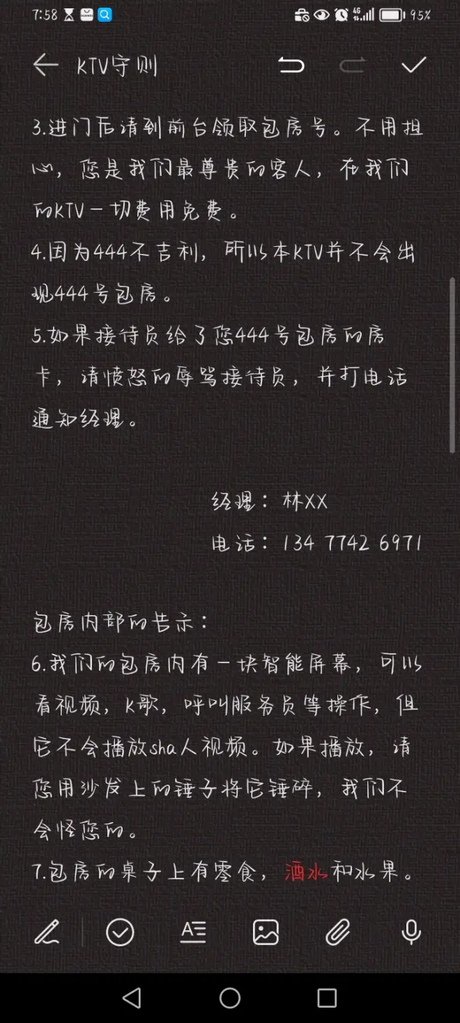 经理:林XX 电话:134 7742 6971 包房内部的告示: 6.我们的包房内有一块智能屏幕,可以看视频,K歌,呼叫服务员等操作,但它不会播放sha人视频。如果播放,请您用沙发上的锤子将它锤碎,我们不会怪您的。 7.包房的桌子上有零食,酒水和水果。饿了就吃零食,渴了就吃水果。这里的酒水是特制的,可以快速增加您的饱腹感。 8.我们的沙发是用动物的皮肤制成的,十分的柔软,它可以根据您的身体状态为您提供最舒适按摩。 9.如果您闻到奇怪的味道,立即通知经理,等待经理用空气清新剂喷洒整个包房。 10.如果您有需要购买的物品,请呼叫配送机器人。我们的机器人系统连接着所有的房间门铃,所以只会有门铃声,不会有“咚咚咚”的敲门声。 用空气清新剂喷洒后在墙上显现的标语:这里就是一场骗局!不要呆在这里,逃出去!出口在#*-/的/**//*-!不要去/+-*+! 酒吧内粘贴的告示: 欢迎来到本KTV自带的酒吧,这里有美味的酒水,你会喜欢的。 通往6楼的楼梯在酒吧最内部,有专人看守。只要给他他需要的东西,你们就可以上去。 本最喜欢喝酒,这对他来说十分美味;暗很喜欢唱歌,请一定要仔细聆听并赞美他;伊不喜欢暗,因为她觉得他太吵了,或许你可以寻求她的帮助。 网吧告示: 这里是本KTV的网吧,这里是整座大楼最安全的地方,您也可以从这里离开。 1.在这里,你需要用一小管血液作为入场门票。 2.请一定要在这里上网超过一个小时,以净化您的身体及灵魂。 3.出口在最特殊的机位。