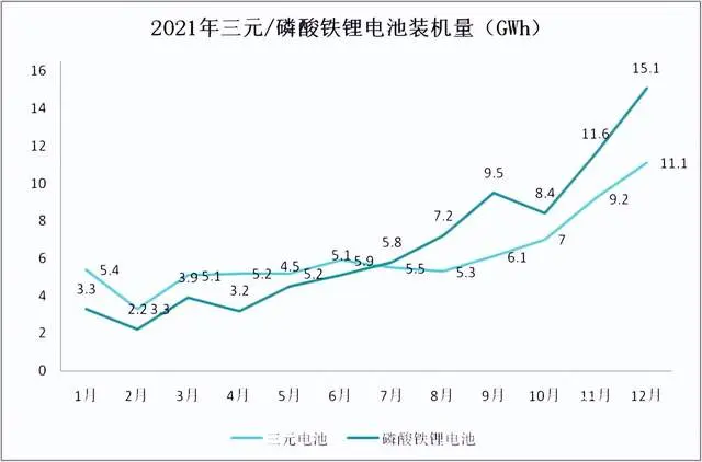 相比三元锂电池,磷酸铁锂电池不仅使用寿命长,而且更加稳定安全,除非温度极高,达到700-800℃时,该类电池才可能出现爆炸危险,安全性能大大提升。这也让许多电池厂商对磷酸铁锂更大的规模市场充满信心。尤其到了2021年,国内磷酸铁锂电池出货量开始连续力压三元锂电池,似有王者回归之相。