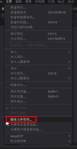 首先在剪辑工作区打开【菜单栏】【文件】下拉列表里的【媒体文件管理】。