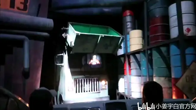 刚刚逃出章鱼博士盘踞的仓库游客们便遭遇到的反派恶鬼想要把游客们的新闻车炸上天,但小蜘蛛又怎会让他得逞?虽然控制住了恶鬼,他随手扔的那个炸弹却将墙壁炸出个窟窿。为了逼真一些,环球让这个地方可以喷火。和第一张图除了颜色不一样外,真是没什么区别。