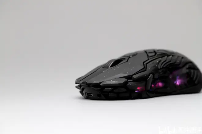 耶梦加德的模具非常复杂,外形繁复、细节丰富,据说组装件有40多个,一个侧键帽就有3~4个塑胶件,作为鼠标来讲是创纪录了,这也造成了它的黑透版与其它鼠标有所不同。在不开背光的时候,它看起来就是个纯黑的鼠标,且表面有银色亮片,像是代表无数恒星;开启背光,内部灯光游离变幻、若隐若现,宛若星云,尤其是侧面效果。