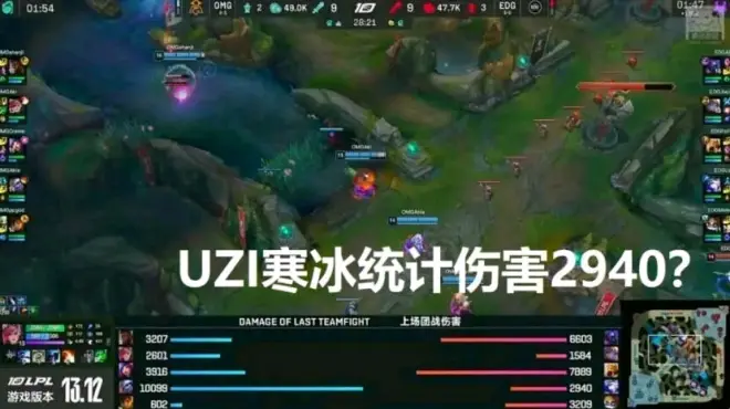 比如最近就有人表示LPL官方也故意偏袒uzi,在比赛中伤害计算和事实不符,强行增加uzi的输出伤害,事情是这样的,当时正是OMG和EDG的对决,在进行到第三局,第26分钟左右的团战中,一波伤害计算确实不对劲。