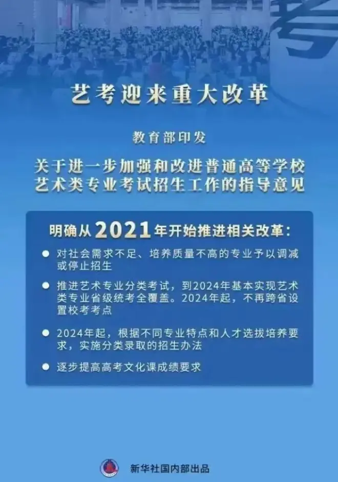 教育部日前印发关于进一步加强和改进普通高等学校艺术类专业考试招生工作的指导意见,明确从2021年开始推进相关改革。优化艺术学科专业布局,对社会需求不足、培养质量不高的专业予以调减或停止招生。推进艺术专业分类考试,到2024年基本实现艺术类专业省级统考全覆盖。严格控制校考范围和规模。2024年起,不再跨省设置校考考点。2024年起,根据不同专业特点和人才选拔培养要求,实施分类录取的招生办法。逐步提高高考文化课成绩要求。
