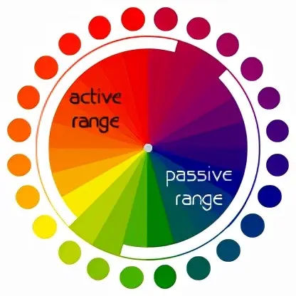 色轮可以分为视觉主动或被动的范围。当与被动色调相对时,主动颜色会显得更高级。当与主动色调相对时,被动颜色看起来会后退。