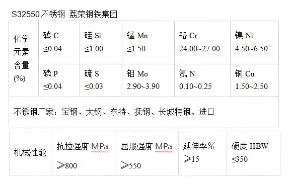 3. 强度和韧性:S32550具有较高的强度和优异的韧性,能够承受高压和冲击负荷。