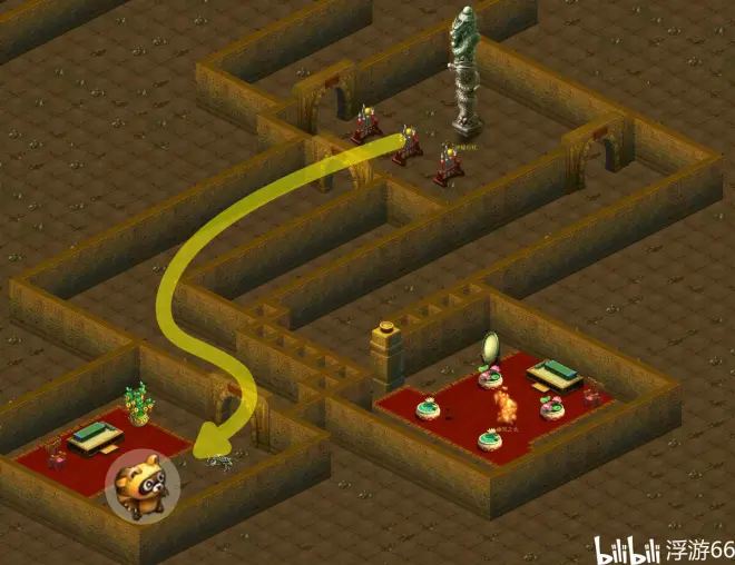回到石柱处(也可以离开副本重新进入),进入左侧的门到达密室,密室中如有小狸猫,玩家需要与它对话。星形位置可能有物品(宝箱、酒坛、蘑菇等),点击会获得钥匙。陵墓中的其它位置还可能有钥匙,副本共需收集3把钥匙。