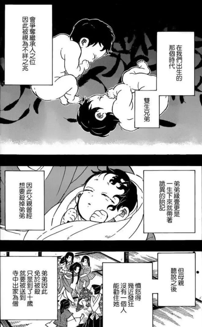 缘壹天赋异禀,引起了哥哥岩胜的嫉妒和惊叹。随后,他被父亲看中,希望他成为继承者。然而,在母亲去世后,缘壹离开了家族,并放弃了继承位。因此,许多人认为他出家为僧。