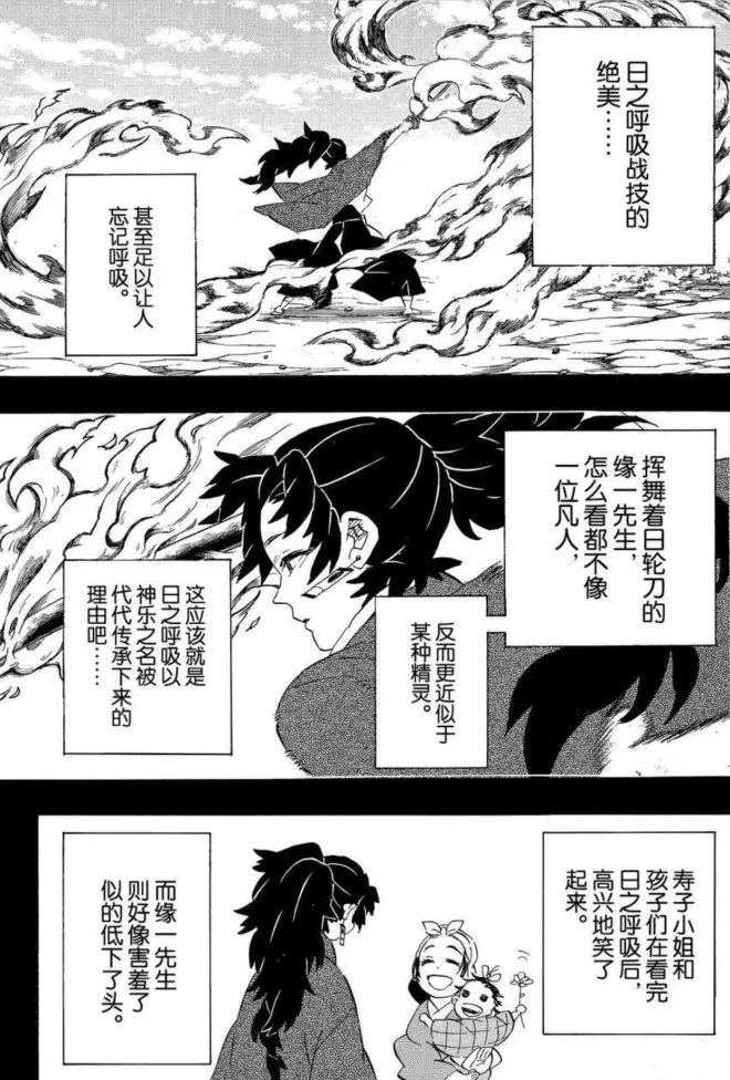 注:在缘壹死后,无惨开始行动,杀死了所有曾学习过日之呼吸的剑士。炼狱家的祖先随后记录道:自从缘壹离开鬼杀队后,由于很少有像缘壹那样能够精通剑技并进行指导的人,猎鬼人们逐渐变得脆弱。