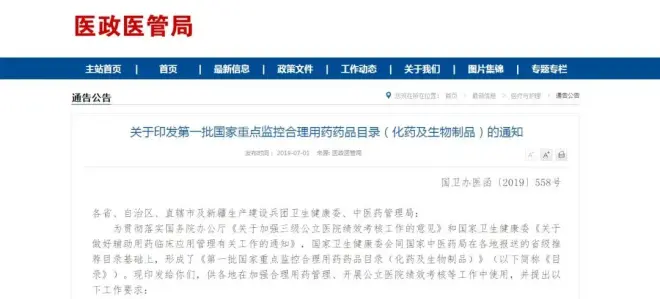 2019年,国家卫健委发布《关于印发第一批国家重点监控合理用药药品目录(化药及生物制品)的通知》。