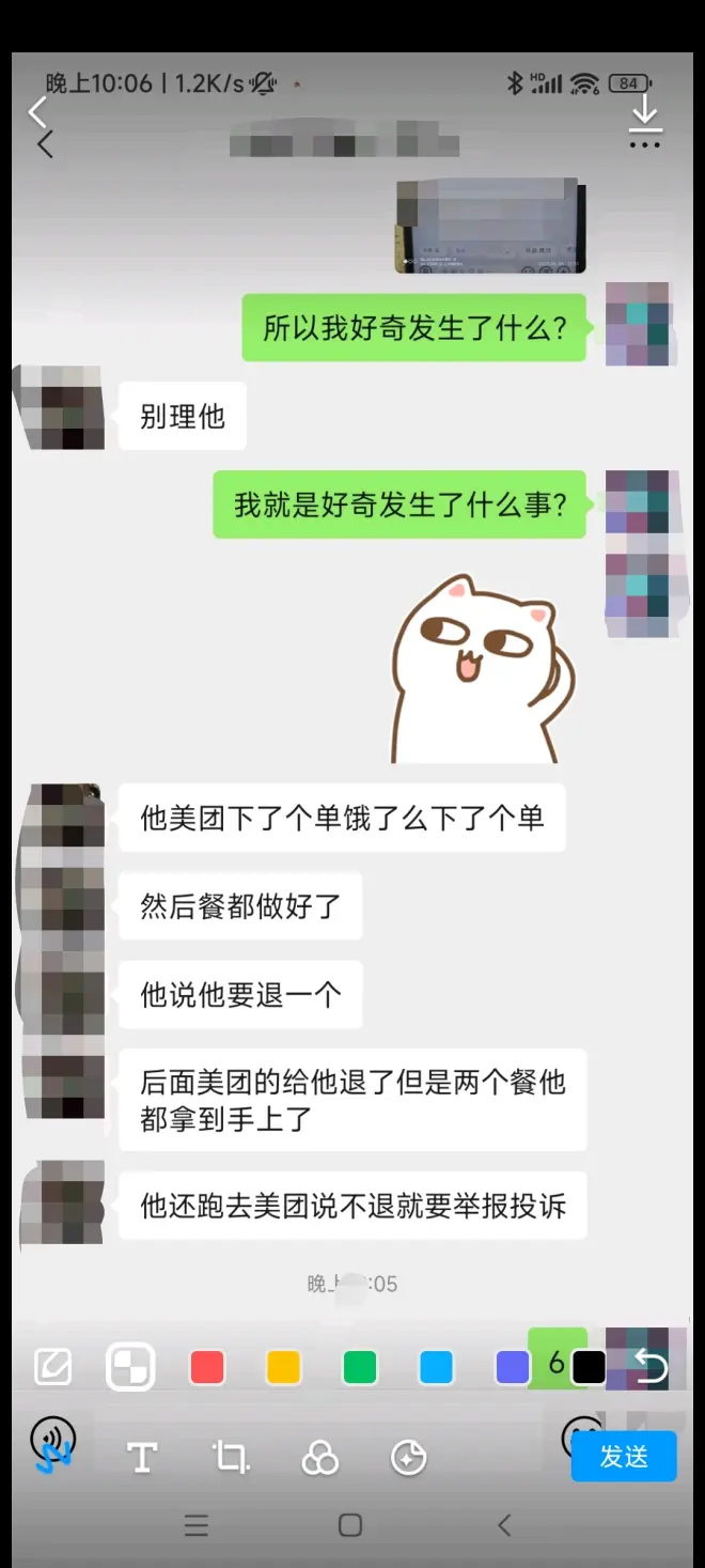 主要是这个客人他美团和饿了么同时点了两单就单点了一个汉堡然后呢,他就给我这小兄弟下了套,他美团先点了一段时间再点了,饿了么,然后他用美团说能不能退一单,两单一样的,他只需要一单,然后呢美团的那一单已经过了一段时间了,单子已经快出完了,小兄弟呢就想着先把他饿了么的退了,因为饿了么的还没开始做,如果退美团的话也不说不能退,但是呢,过程比较烦躁嘛,而且还是用的小兄弟自己的钱本来我这小兄弟手底下就有点缺钱,过得比较紧,我帮他把钱还了,他还欠着两个月的钱然后呢,他帮那位顾客把饿了么的退款了然后他就掉进了这个坑,那位顾客他非要退美团的,因为他是在美团上说的,而且如果我们小兄弟不退,他还会威胁说他会去向美团官方那里举报。