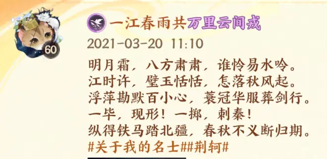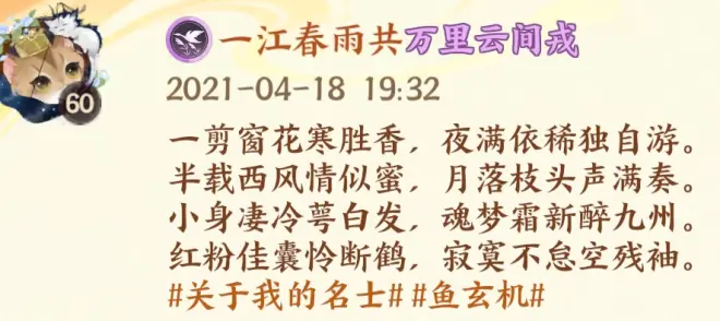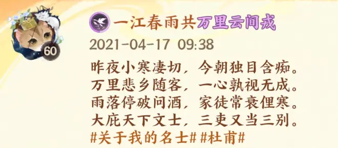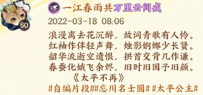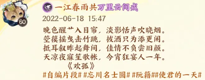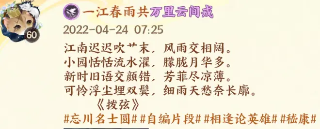 在网易的几款我比较喜欢的手机游戏上我都是以自己创作的短文中的一句作为游戏名,比如我的主游阴阳师,名称是一江春雨半点寒。出自阴阳师刚开服那年我在个人微信朋友圈发的原创短文: