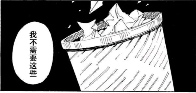 第四格为大特写镜头:特写是表现情绪的好镜头,将特写放在垃圾桶,交代爱瑠子1.把信同他们的爱扔垃圾桶,十分冷漠,主要交代情绪,技法上涂黑更交代这种情绪