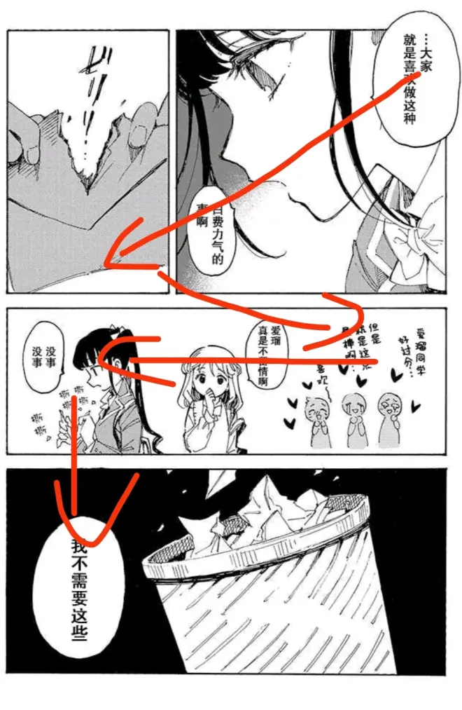 第三格为中景:第一格摄像机不变拉远,交代人物关系,表现各人物心理,将爱瑠子撕信拉远看,群众不重要弱化,女配优柔寡断唱红脸,突出爱瑠子坚决唱黑脸,阅读为右上到左下,横长格背景放空主要交代情绪,过度格不特别重要,去除不影响读,但影响情绪,客观镜头