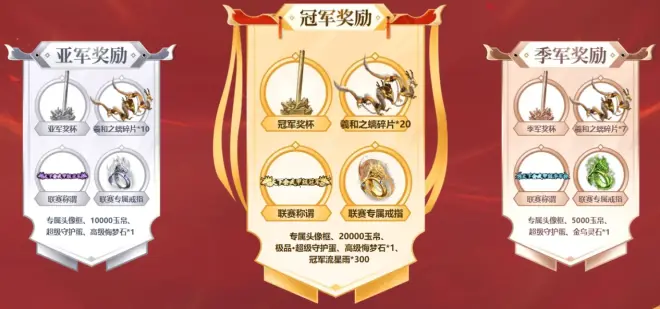 经典版三强队伍,将每人获得一座实体奖杯、联赛专属戒指、联赛称谓、专属头像框、超级守护蛋碎片、精品武侯图礼包、悔梦石、点卡等豪华奖励。