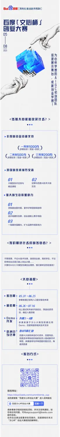 百“模”齐放的序幕已经拉开,这一轮全球AI再造的浪潮刚一开局就进入白热化阶段。距离百度发出“AI英雄召集令”已过去半月有余,最近消息称,目前百度已收到报名申请数百份,参赛项目广泛覆盖生产力工具、文娱、营销、人力、医疗、教育、金融等各个场景,不乏已获多家一线机构投资的优质项目。 百度创始人、董事长兼首席执行官李彦宏曾指出,“我非常看好中国AI应用的发展前景,如果回顾过去几十年历史,在中国大家都非常愿意拥抱新兴技术。虽然我们没有发明Android、iOS或Windows系统,但我们开发了许多非常创新的应用,比如微信、抖音和滴滴等,还有很多应用都很受欢迎、很实用。在人工智能时代,也是同样的情况。科技带来了很多可能,我们非常善于开发应用,并充分利用了这些可能。" 放眼国外,AI原生应用风起云涌,已经出现了比如估值超2亿美元的DoNotPay、估值超15亿美元的Jasper等AI原生应用,行业均一致认为AIGC/大模型将给产业重大影响,大模型时代将诞生比移动互联网大十倍的平台机会。此次参赛团队对于百度“文心杯”创业大赛的热情,也印证着开发者、创企对于国内AI原生应用市场的信心 “未来,我认为中国会有自己的生态系统,拥有自己的大语言模型和基础模型。中国会出现至少一个、也可能是两个或三个基础大模型,可以支持人们开发各种AI原生应用。比如,百度的文心大模型就致力于成为AI开发者的默认基础模型之一。"李彦宏在摩根大通全球中国峰会期间表示,“为打造更有活力的生态系统,并帮助开发者开发各种AI原生应用,百度计划设立一个10亿元人民币的投资基金。我们还将推出“文心杯”创业大赛。参赛者可以提交想法和原型,我们将寻找最有潜力的想法,并为其提供资金。美国开发者正基于ChatGPT或其他语言模型开发新应用。在中国,更多开发者将会基于文心大模型来开发AI应用。” 此次大赛也表示出百度愿成为AI创企最强有力的“加速器”的诚意,将为开发者、创业团队提供资金+技术+业务资源的全面扶持,使得大模型不只是“高阶玩家”的游戏,真正走向技术普惠。 据悉,此次大赛报名持续到6月25日24:00关闭。按要求,参赛团队需专注于AIGC、大模型创新应用方向,有意愿且有能力基于文心大模型搭建应用,或将文心大模型与自有产品进行结合。无论是有创业计划的初创团队,还是有成型产品或demo的初创公司,均可参赛。大赛将为参赛团队开放文心大模型相关能力及百度智能云算力资源,并邀请来自IDG资本、百度风投、百度资本等知名机构投资人与多位百度AI专家担任评审。获奖团队有机会获得总值1000万元、500万元、200万元的资金与资源投资,以及AI大模型技术辅导与交流赋能。 同时,百度还将设立规模为10亿元的文心投资基金,面向AIGC领域潜力股创企,提供涵盖资金、技术、业务资源在内的全面扶持,持续关注AI领域优质创业团队,推动中国AI大模型生态繁荣。 参赛人员可百度搜索“百度文心杯创业大赛”进入官网报名或直接点击下方链接。 报名网址:https://cloud.baidu.com/summit/ernie_cup 报名参赛详细信息见海报 ▼