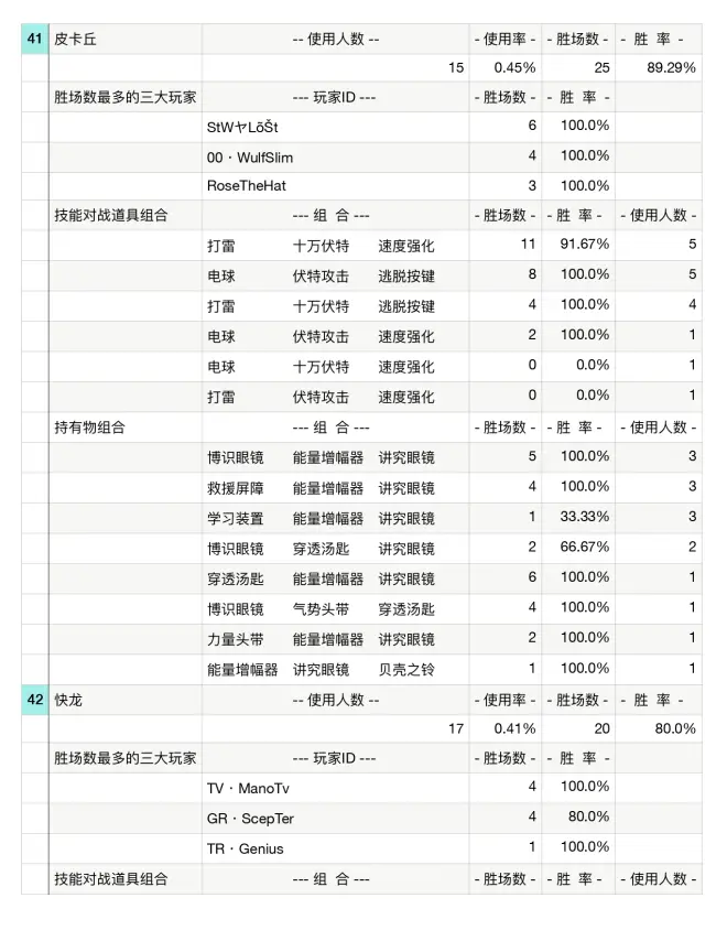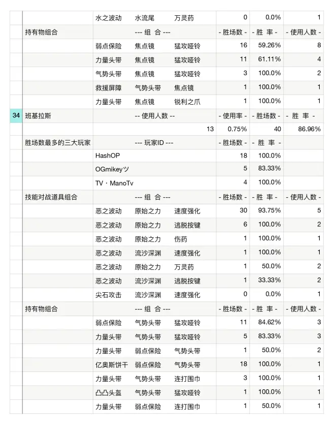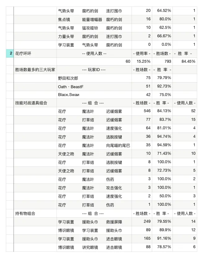 百大玩家使用率:顾名思义,统计过去7天冲进过前百的玩家的排位统计,同时记录对战道具,技能和持有物,适合高端玩家以及三排以上为主的玩家。
