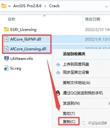 18.返回之前解压的“ArcGIS Pro2.8.6”文件夹,双击打开“Crack”文件夹,选中两个“AfCore”文件,鼠标右键点击“复制”
