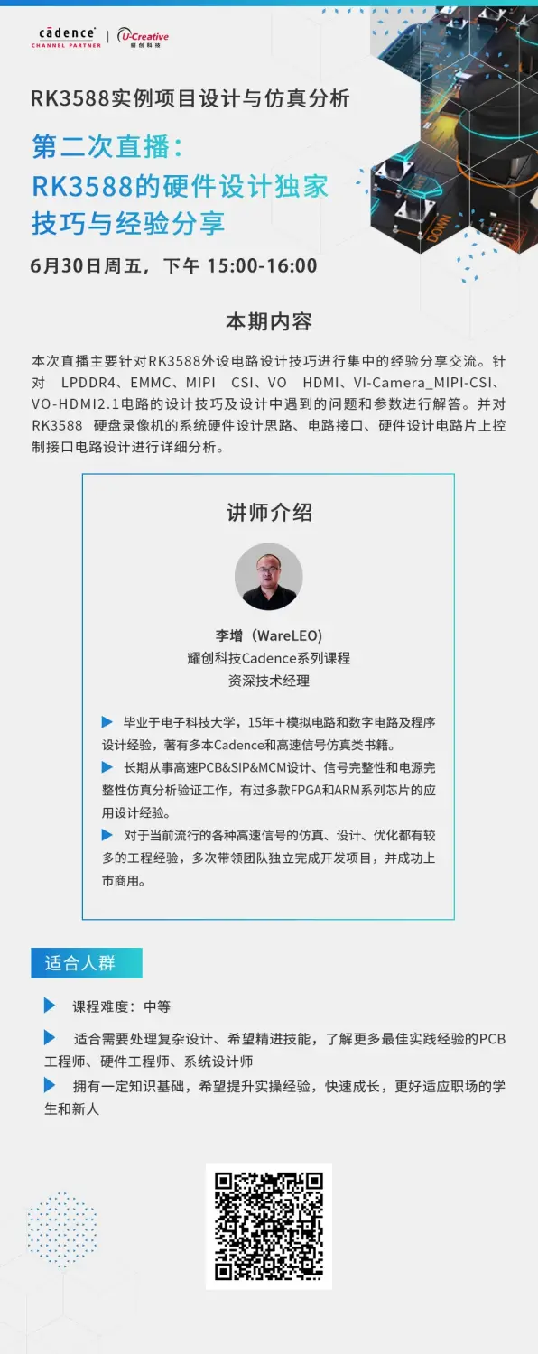 识别下图二维码,报名参加 Cadence 官方经销商技术老师举办的【RK3588实例课程直播系列】第二场线上直播: