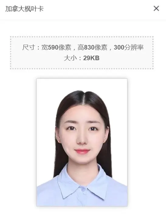 加拿大枫叶卡照片尺寸为50x70mm,头部高度要在31-36 mm之间,要半身照,要白底。