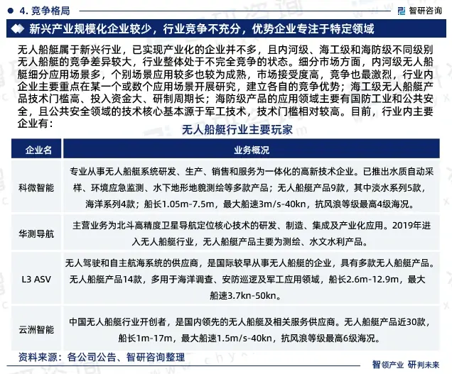 无人船艇属于新兴行业,已实现产业化的企业并不多,且内河级、海工级和海防级不同级别无人船艇的竞争差异较大,行业整体处于不完全竞争的状态。