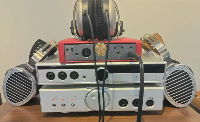v2在我的破烂设备上面的表现,自然不能让我满意。于是乎,我提着se和v2来到了当地的一家耳机店想给HE1000v2上上强度,看能不能带来一耳朵提升的听感 (下图中是 声韵牵牛星G2.1 + Allnic HPA-3000GT),拉近两者的差距