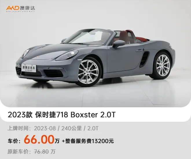 保时捷718向来都是“炙手可热”的车型,不管是小姐姐或者小哥哥,都非常合适,而这款敞篷的趣味性更多一些,打开篷感受大自然的美妙真的是一件非常浪漫的事情。这台是23年8月上牌的保时捷718 Boxster 2.0T,虽为入门动力版本,但其实对于大多数消费者而言完全够用,毕竟保时捷的出色操控性是大众认可的,这台选配了大约12万,有极地灰色漆、波尔多红真皮内饰、64升燃油箱、动力转向升级版、19英寸Boxster S车轮、加热式多功能方向盘、头枕盾徽等,还有车衣,200多公里,价格不过66万!