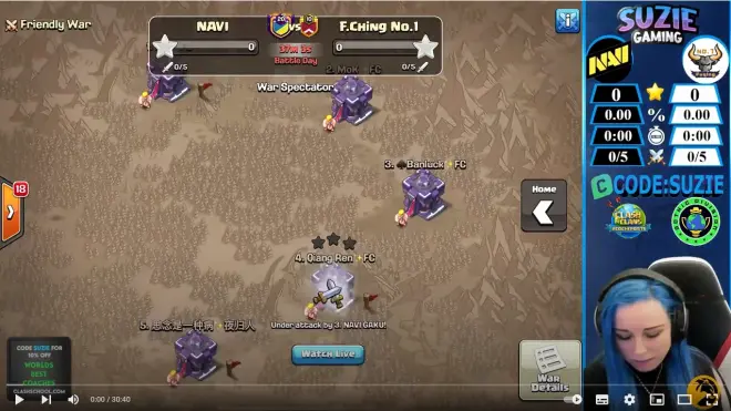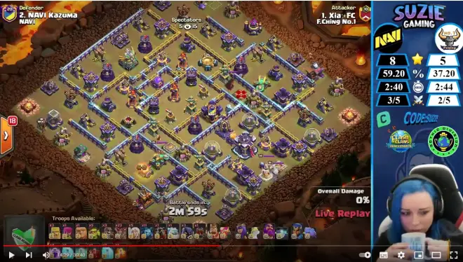 福清这边是17个观战啊!首先天女2点钟往下滑,投石车12点放,女王被投石炮连弩集火但是问题不大,下面哥布林打掉2个水罐中间的让女王往里走,开狂暴顶住连弩压力,再补一瓶狂暴爆本,并且紧急放隐身,他甚至还能接着打点援军!然后2点钟龙骑一字划,投石车爆了以后下来的是火箭气球兵和龙骑,因为女王在下面所以总体来说龙骑在50分钟之前问题不大,右面天盾流再加上一个残血蛮王,有地兽,有大还有1个冰冻的情况下打女王加投石炮是没有问题的,最终可惜女王打死了飞盾,最终2星