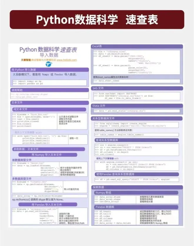 整理了Python科学速查表,就可以帮你解决以上的问题。当你在练习的时候,能够让你迅速地找到对应的函数,很方便的掌握Python!