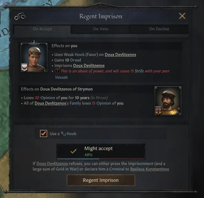 除了主要互动的剥头衔-造宣称-抢封臣的循环外,摄政者还可以利用多种其他权利。其中一个就是可以囚禁领主王国内的角色: 这不仅包括了封臣同僚,还包括其他封臣的廷臣,以及那些路过的宾客等.