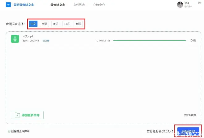 第2步:点击需要转写的语言和识别的领域,点击“开始转写”,即可自动转写为文字啦。