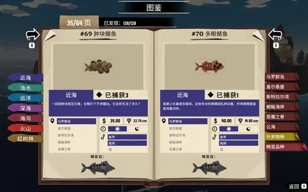 算上畸变鱼游戏中一共有128种鱼类,这些鱼分布在地图的各个地方,很多都需要有特定的鱼竿或者是钓具才能捕捉,每种鱼类在图鉴中都有精美的绘画和详细的捕捞描述,不过因为即便是没抓过的鱼也会显示捕捞条件,导致全图鉴的难度很低。