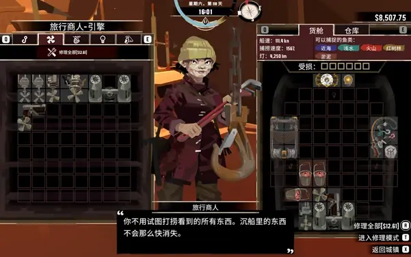 而游戏的捕鱼主要是通过这种小游戏,不同的鱼抓起来有些许不同,不过总的来说还是大同小异了。此外游戏也在一定程度上参考了生化危机系列的背包系统,想办法用鱼塞满船舱也是游戏的一大乐趣。