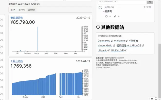 已知问题:需要注意的是,粉丝数基本上在2022年之后才有较为齐全的数据(下文介绍的其他网站也有类似现象),往往也并不是每天都会进行抓取,尤其是对于粉丝数不太多且变动不大的中小UP主来说,往往一个月只有几天的数据(目前仍然如此)。至于占大多数的、粉丝较少的“底边”UP主,则并没有被收录进去,需要向站方手动添加。相反,直播营收数据却相对齐全。另外,06观测站统计的直播营收是当天24小时内的营收,而不仅限于直播时段,这与下文的其他网站不同。