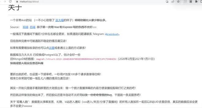 与前述网站不同,在Matsuri ICU可以查询每场直播具体的弹幕列表。原理大致是,网站通过API获取直播弹幕列表,并将其返回的用户UID与其用户名匹配。除此之外,网站还统计了弹幕热门关键词在直播不同时段的出现频率,并以折线图的方式呈现。收录的主播主要是虚拟区,但也可手动添加。